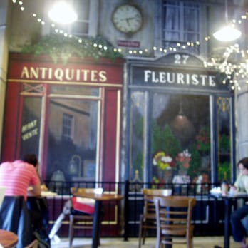 I've been stopping in here on occasion for a while now (at least the last three name changes), and I love the new look. The tables are painted and decoupaged to go with the new theme, and the mural is georgeous! There are many small tables and chairs and a few big comfy couches and armchairs.