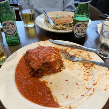 As we walked in, we were greeted and seated by the window. The ambiance hasn't changed much since the first time I dined there over 10 years ago, it was still a unpretentious, but at times energetic spot, that focused on service and food. After a few minutes at the table, our waitress came by to collect our drinks and food choices, and dropped off some warm bread and olive oil. The olive oil was extremely flavorful and included some divine olives. My Peroni arrived shortly afterwards and the Melanzane Ripiene (stuffed eggplant) we order came a few minutes after that. Our waitress noticed my partner's limoncello martini hadn't arrived yet and apologized for this. She came back with it two minutes later as we were thoroughly enjoying the ricotta stuffed eggplant with mozzarella on top, smothered with their tomato sauce. Shortly after finishing that, our main entrees came. I ordered the Linguine Frutti di Mare in a white wine sauce and my partner ordered the Ravioli Antonio, which is the lobster ravioli that comes with sauteed salmon and peas in a light cream sauce. Both entrees were generous portions and very fairly priced as well. Each tasted very good and packed with fresh seafood, I left Carlo's how I used to leave when I was in college- barely able to stand up and walk but happy.