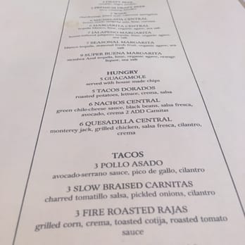 I'd order the tacos and margarita again in a heartbeat. I might even have enjoyed them so much that it kept me up at night thinking about the flavor and the next time I can back to Cocina Central to do it all over again.Helpful 36Thanks 0Love this 37Oh no 0 - Geri W.Mountain View, CA378475383Apr 17, 2016Updated review
