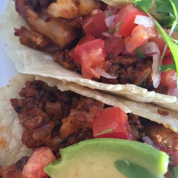 # Soy Chorizo Y Papas with 3 Tacos ($11) - Corn Tortillas were soft and fresh as promised. This serving comes with Avocados, tomatoes & roasted potatoes mainly. Veggies were fresh including the leaves used for garnishing. The roasted potatoes added perfect flavor to the whole dish, simply YUM! & tasted more like Indian Chaat!