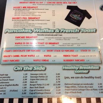 Happened to stumble here when my brothers, my mom and I picked up my little brother from UC Berkeley. We were starving, so I went on Yelp and searched Denny's or maybe it was IHop, and Digger's Diner showed up. The reviews were good so we all decided to stop by. This place looked small from the outside, but once you walk in it is actually spacious. We sat down right away and ordered our food. Everything here was soooo inexpensive and the portions aren't bad either.