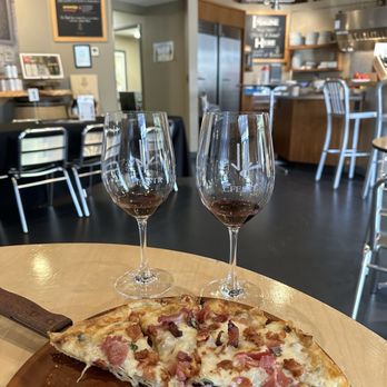 I went here as a stop in Woodinville before continuing onwards for a small road trip. This place has a warehouse type of ambience, fairly lowkey, with wine tastings at $25 and pretty nice food options. My friend and I splitted one wine pairing and got the pancetta pizza. The wine pairing had a good amount of alcohol (first pour was just on one glass, but subsequent pours on both glasses, so they might have made a mistake and gave us 1 pairing each, which was a nice touch). In addition, they offered us a "sample" of the Feral sauvignon blanc that was quite delicious and very well priced for a bottle ($25), and the sample is not even a splash, it was like half a glass of wine. We also wanted to consider another type of bottle, to which the server graciously offered another half glass to let us "sample."