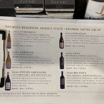 I absolutely LOVE EFESTE. It is one of my most favorite wineries in Woodinville and they have the best wines, ambience and staff. Always so welcoming and friendly. Chef Jason is there on Thursdays and Fridays and he has some immaculate food. Check out their tasting room in Woodinville. Highly recommend the library wine tastings that are available today. My favorite go to wine is Final Final!