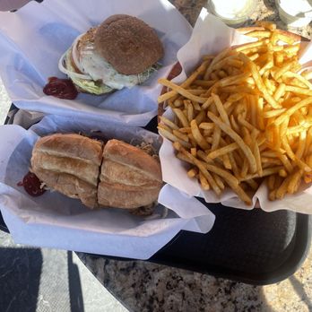 My husband and I like this place, we've been here a few years ago and liked it, we came again on a Sunday after they opened and people were already there. We ordered the tri-tip sandwich and a basket of fries to share for the table, we enjoyed it all. I was only able to eat half of the sandwich, but saved the rest for later. Definitely a good size sandwich. Ambiance is family friendly, there is seating inside and outside, food came out quickly too.
