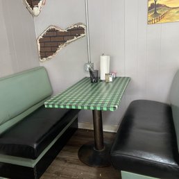 Although going for the old fashioned diner look, the inside of the restaurant needs some attention. We sat in a booth (in the corner), and definitely regretted that decision. I faced the wall, and the booth back was so unsecure that whenever the person sitting behind me (2 different customers during our visit) moved, I was thrown forward. One was a woman when we arrived; another was a thin man when we left, so this wasn't caused by a huge customer bumping around. It was constant, and I was lucky not to leave wearing my food or drink.