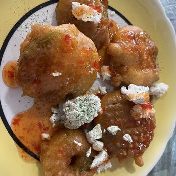 Ordering was quick, and we waited for our appetizer. Fried green tomatoes. I love fried green tomatoes and have had several different varieties. The ones advertised looked amazing. But that's not what arrived.