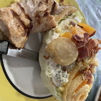 Next came the entrees. Again, I ordered based on a post. The wedge salad picture looked delicious in the post. But that wasn't what arrived. It didn't even have the bacon on it. I asked and the waitress said "really they didn't put it on there?" Nope. I love bleu cheese, but it was so strong that I couldn't eat it. I added grilled chicken to the salad. It came on the side and was really dry.