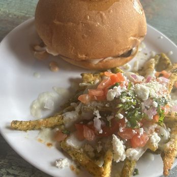 The inside is cute but it is small and can feel congested. It had windows that looked out onto the street and provided natural sunlight. Our sever was polite and overall had good customer service. The amount of time we waited to receive our food was entirely too long. We waited for about an hour and my fries were not hot, which is disappointing after waiting so long. My burger was made well, had a lot flavor, and was hot. The fries that I paid to upgrade were stuck together and cold. They were flavorful but my meal would have been more enjoyable with a reasonable wait time and fresh fries.