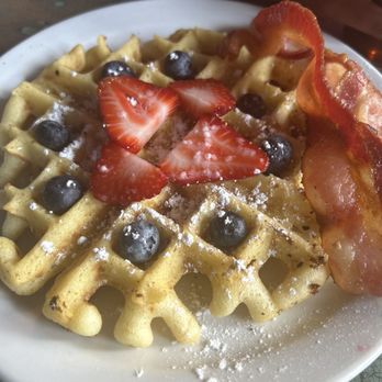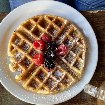 Belgian Wallfle: Topped with Classic powdered sugar and fresh fruit. Crispy exterior and light and fluffy once you take a bite. Super classic taste.