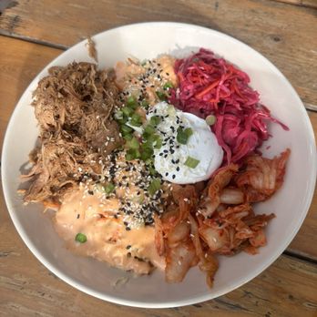Fried Rice Protein Plus- 11/10 my favorite! Comes with tender pulled pork and this sriracha aioli that is to die for