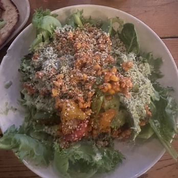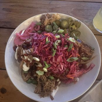 We loved the wide variety of vegetarian and vegan options! We ordered the Vegan Nacho Fries and the South Bowl with Avocado Cilantro Lime dressing. The vegan nachos were fresh and crisp with. Yummy vegan queso and soy chorizo. It also had kimchi topping that gave it a tang and some heat. The South Bowl with baked tofu packed a punch of health with a lot flavor. Tofu has a lot of flavor and is one of the best baked tofus I've ever had! This bowl has a lot of food so I would recommend sharing it out planning to take extra home (unless you've been hiking all day- then you might want it all!). We also got a peanut better cookie with miso. It tasted like a peanut butter cookie but with a bit more depth to the flavor profile. Food was quick to come out, and everything was awesome! We loved getting both healthy and flavorful options for dinner!