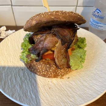The burger was a decent size but the patty was not commensurate with the bun as the bun was bigger. The bun tasted like a whole grain bun and didn't taste great. The meat, cheese and BBQ sauce tasted good but not a great deal for 15 euros. Three stars!