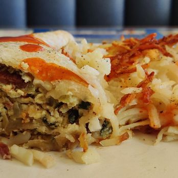 Breakfast burrito had 3 eggs and you choose the meat, veggies and cheese. My selection was bacon, spinich, green chili and pepper jack cheese. Burrito had a large portion of hash brown. Had this for two meals.