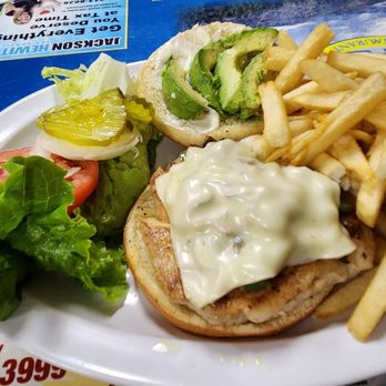 I scored a chicken avocado sandwich with a side order of fries. Sandwich came with melted cheese, tomato, onion, and lettuce on it. It was also so huge I had to put a major squeeze on it to fit it into my mouth. Downside was that all that pressure sogged out the bread enough that it was disintegrating by the time I finished the sandwich. Which shows that the chicken was juicy as well as tender.
