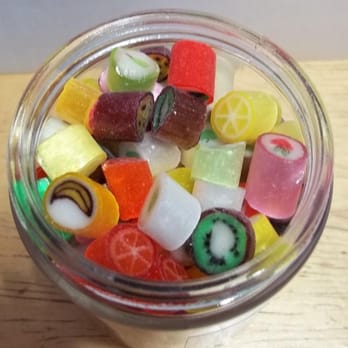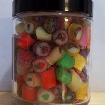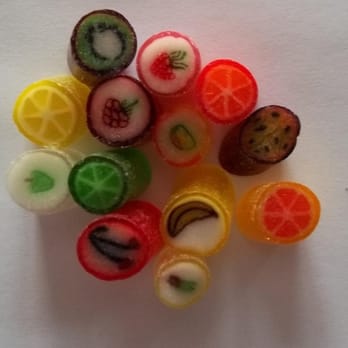 I was swooooon when I saw the mixed fruits candy: http://static.px.yelp.com/bphoto/rfIwlSfS1--et_ndpdSe0A/l In each piece, it has a cute little fruit drawing in it. If it's strawberry flavored, there's a cute strawberry in it. If it's kiwi, the whole thing looks like a slice of a kiwi -- same with the orange, lemon, lime & grapefruit. The candy tastes good and the presentation is uber articulate. I opted for a small jar of passionfruit only -- the best tasting fruit one!
