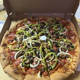 We ordered pizza to go from this place here and let me tell you it's probably the best pizza in town. I felt like I was eating a real pizza. our order was ready when promised atmosphere was great.