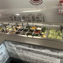 Great place. Bright and welcoming. The staff is friendly . There was a lot of pizza and salad condiments to choose from. Highly recommend. Way better than any other pizza factory Iv been to and way better than round table buffet