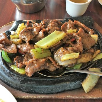 -Sizziling plate pepper beef - This one isn't super spicy (unless you find black pepper spicy), but the beef is super tender and falls apart in your mouth. Flavorful and served with celery, onions, and bell peppers, this is the staple "non-spicy" dish in our order.