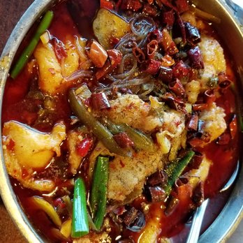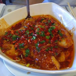 -Water boiled fish - numbing and served in a bath of chili oil and peppers with bean sprouts at the bottom of the bowl. Fish is cooked perfectly! pieces are large, unlike some other places I have tried where the pieces are small slices.