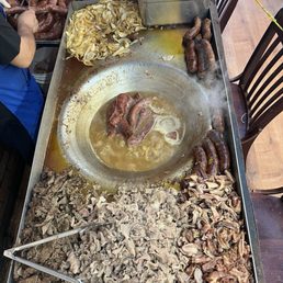 they had a guy inside set up with a flat top w carnitas and pork parts that looked pretty good, along w onions, chorizo, and jalapeno. $15 for a decent sized plate of food. pork had been sitting and wasn't great. chorizo very good. comes with a handful of tortillas.