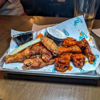 Teeth is a fun bar. The bartenders and staff are great. The front area was full of young people. The patio area was for more older people. I'm here because of Paolo's review. He mentioned 50 cent wing Wednesdays. A pint of Modelo and 10 wings is about $13. I tried their buffalo and lemon pepper on the first round. The wings are on the smaller side and very salty. You will need ranch. For the 2nd round, I tried their BBQ and teriyaki. The first round was much better. It was tough to eat 20 wings and garlic fries. The wings tasted less delicious the more I ate them. The little carrot and celery sticks were a nice change of pace. The garlic fries felt dry. An hour later, my mouth is still wonky from eating all that salt.