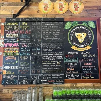 Triplehorn Brewing Co is a Production Brewery of Craft Ales. Our house favorite is our Land Wink Dry Hopped IPA. For a great thirst quencher, try the Falcon Cloak Blonde Ale; A crispy clean lightly hopped Blonde, that has the nickname Brigette Nielsen...she's 6.3. Got a malty beverage in mind, try the Folkvang Irish Red. We have 10 taps available, and continue to add to our lineup! The NeMeSis Nitro Milk Stout, at 10% ABV is now a staple in our lineup, and we've introduced Symbel, an American Wheat Ale at 4.7% ABV, a fantastic session beer that will be seasonally paired with Strawberry, Raspberry, Blood Orange, Mango, and Black Cherry!
