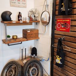 I've walked or run past this hundreds of times but never gone in. I'm glad I finally did! As the name suggests there is a motorcycle garage (I think it's a diy/membership model?) attached to a coffee shop. The coffee shop side is not overly motorcycle-bro-y despite the name. More... motorcycle hipster vibes. The coffee shop also sells beer, wine, and some small food items. (The pastries seem to be made in house!)