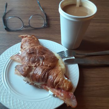 First time trying Ugly Mug -- fun name. Ate an Egg Croissant Sandwich with the bacon and Swiss cheese options. Drink was an Americano. The sandwich was fantastic. I enjoyed the poached egg and tomato slice. It was served on a real ceramic plate and with real metal knife and fork -- nice touches.