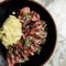 The skin is seared brown. The meat is a bit gamey & there is a touch of blood to add a hemato-minerality. Nice succulent meat that has a good meaty chaw for some paleo based goodness. (Order this at the beginning since it takes time to prepare.)